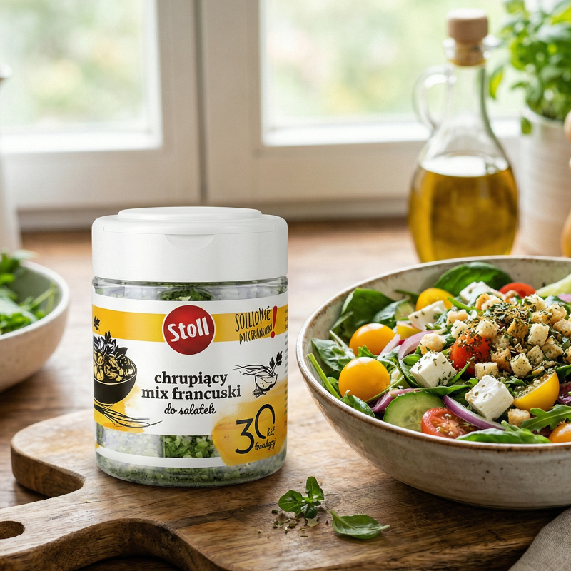 Przyprawa chrupiący mix francuski Stoll to bukiet delikatnych ziół ogrodowych kontrastujący z drobno krojonymi grzankami, które nadają sałatkom oraz potrawom z jaj i serów świeżego aromatu oraz chrupiącego charakteru. Chrupiący mix francuski to wyśmienita przyprawa do dań i przystawek z dodatkiem jaj, a także serów białych. Doskonała również do kanapek oraz tradycyjnej jajecznicy. Dodatek ten pozwoli na stworzenie wyjątkowych doznań smakowych. Już odrobina wystarczy żeby wprowadzić twoją sałatkę w inny wymiar smaku i chrupkości. Wystarczy, że połączysz go ze swoimi ulubionymi warzywami.