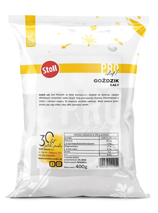 Opis: piękne, dorodne Goździki Stoll wybijają się z tłumu pięknym, jednorodnym wyglądem oraz pożądanymi walorami kulinarnymi. Mają przyjemny, korzenny i słodki wyraz z lekko piekącym i jednocześnie rześkim tłem. Goździka Warto wspomnieć o Świętach Bożego Narodzenia podczas, których goździk króluje w domowej kuchni nie tylko jako przyprawa ale i aromatyczna ozdoba.