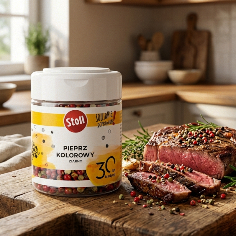Opis: dorodne i wyselekcjonowane ziarna pieprzu czerwonego, zielonego, pieprzu białego oraz czarnego w doskonałych proporcjach. Poza walorami dekoracyjnymi cieszy wszechstronnym zastosowaniem w każdej kuchni.