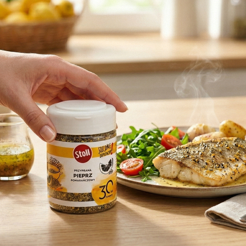 Opis: pieprz pomarańczowy z serii Stoll to wyrafinowana kompozycja aromatycznego pieprzu czarnego młotkowanego o równej, wyraźnej granulacji z wyraźną nutą słodyczy i pomarańczy.