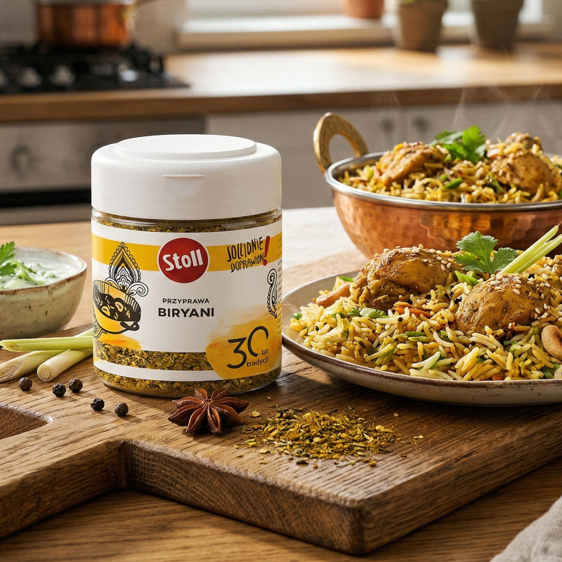 Opis: charakterystyczna, pikantna kompozycja przypraw z wyraźną nutą trawy cytrynowej i sezamu inspirowana tradycjami kuchni indyjskiej. Stanowi doskonałe urozmaicenie smaku i aromatu mięsa drobiowego jak i dziczyzny, wieprzowiny, a także potraw z ryżu, pieczonych pieczarek oraz dań kuchni indyjskiej i tradycyjnej potrawy Biryani.