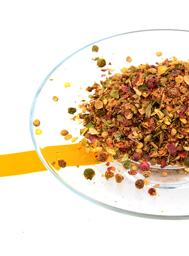 Składniki: chili, czosnek, papryka czerwona, sól, pieprz kolorowy (czerwony, biały, zielony), cebula, kolendra, oregano, kmin rzymski, bazylia, pietruszka, cukier, tymianek, naturalny ekstrakt papryki, rozmaryn, naturalny koncentrat cytryny, aromat pomarańczy.