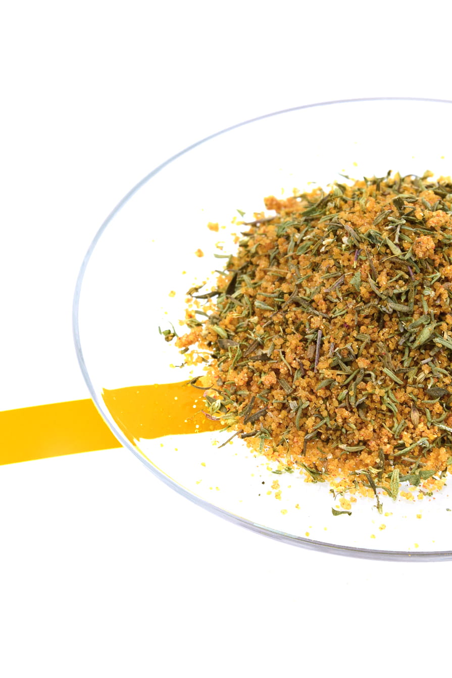 Składniki: sól, cukier, majeranek, papryka, cebula, curry (kurkuma, kolendra, imbir, papryka, kozieradka, kmin rzymski), pieprz biały, imbir, czosnek, naturalny koncentrat cytryny, naturalne ekstrakty majeranku i jałowca.