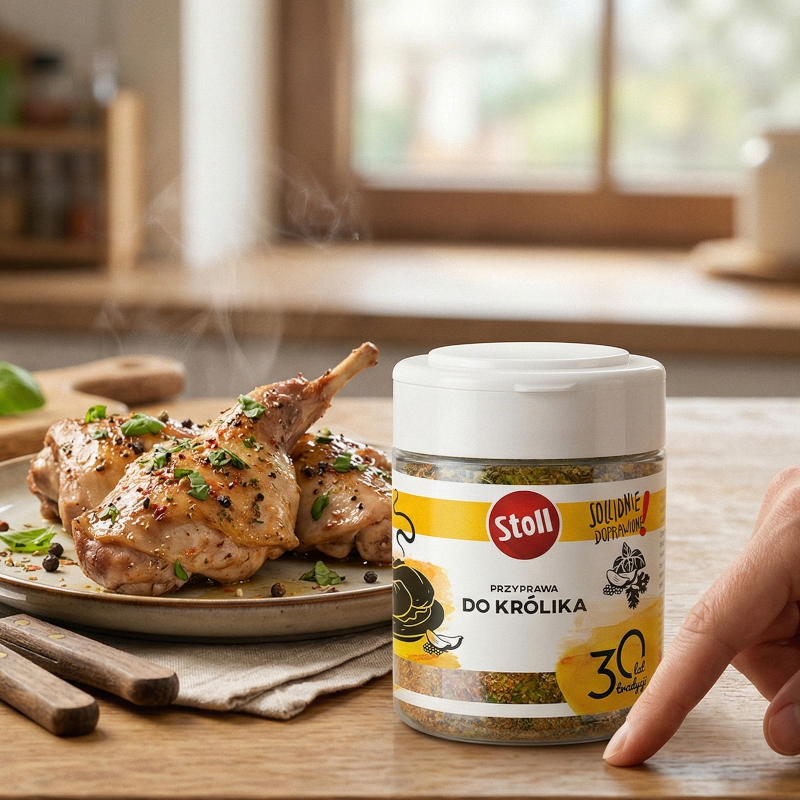 Przyprawa do królika Stoll to idealny dodatek do tego soczystego i delikatnego mięsa poddanego pieczeniu, duszeniu jak i smażeniu. Kompozycja specjalnie dobranych ziół i przypraw nadaje mu niezrównanego smaku oraz aromatu.