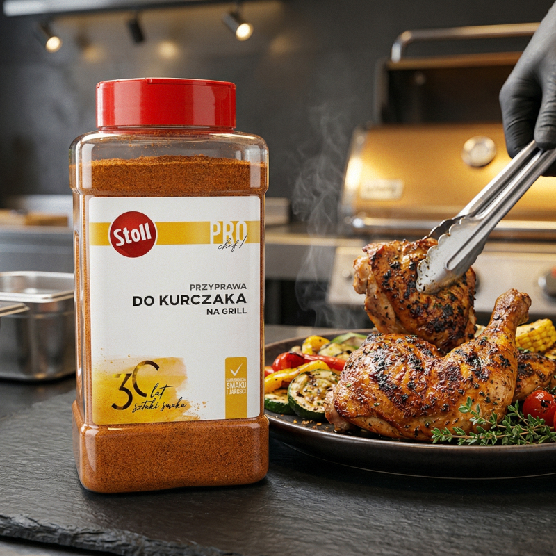 Opis: to wyjątkowa, jedna z najpopularniejszych w Polsce przypraw z przeznaczonych do mięsa drobiowego - szczególnie do elementów kurczaka. Dzięki specjalnej, opartej na wysokiej jakości naturalnych składnikach formule oraz autorskiemu procesowi produkcji, przyprawa nie przypala się podczas obróbki cieplnej. Nadaje mięsu apetycznego wyglądu, złocistej i chrupiącej skórki oraz pożądanego smaku i aromatu z wyraźną nutą papryki i czosnku.