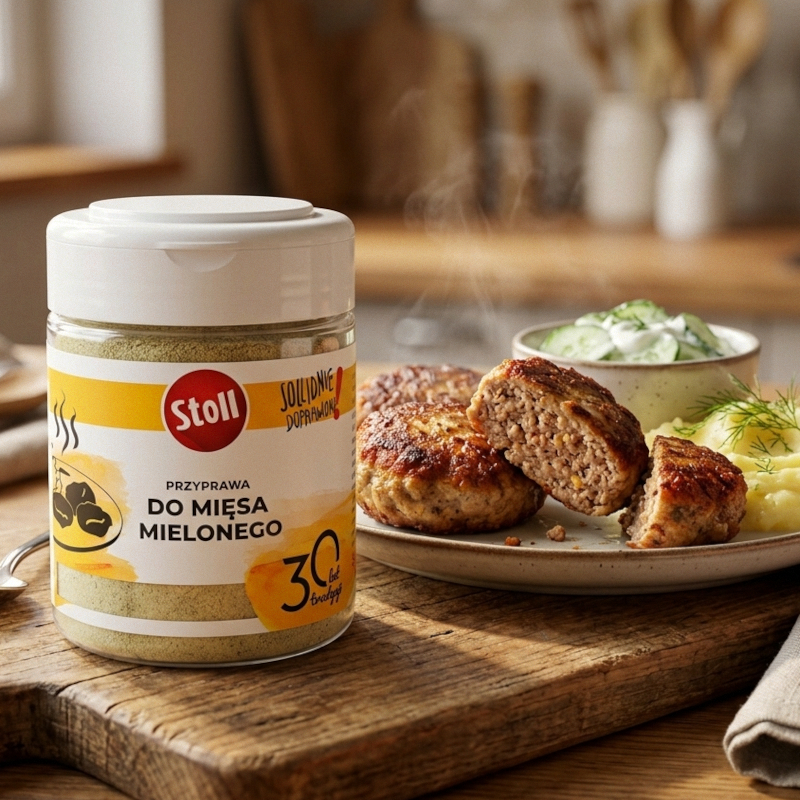 Opis: starannie dobrana kompozycja przypraw na bazie suszonej, drobno zmielonej cebuli oraz równie rozdrobnionych przypraw i ziół z dodatkiem bułki tartej przygotowana specjalnie do tradycyjnego, polskiego mielonego. Słodka w smaku, delikatnie pikantna przyprawa świetnie podbije smak mięsa przeznaczonego na tradycyjnie smażone kotlety jak i mięsnych farszów do innych tradycyjnych dań czy burgerów.