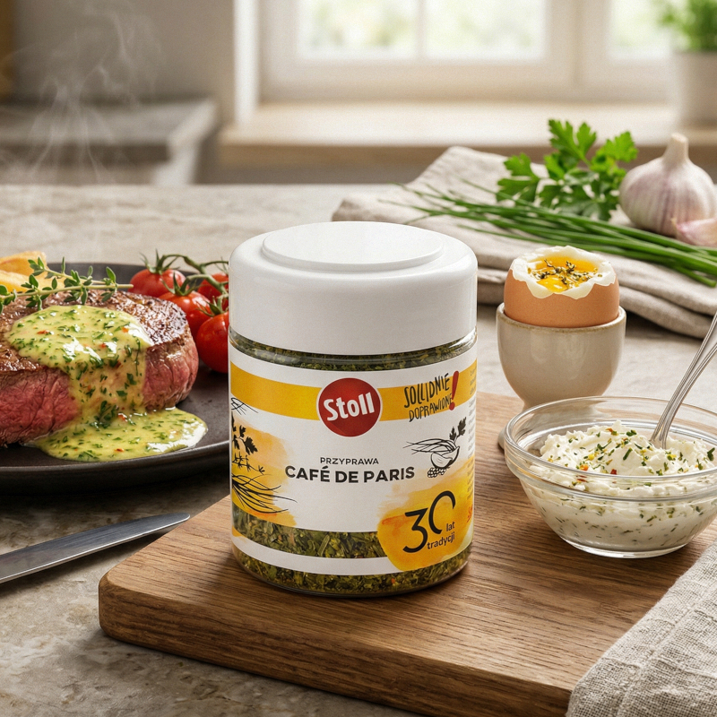 Opis: zioła Café de Paris Stoll to wysublimowana kompozycja inspirowana tradycjami Szwajcarskiej kuchni. Szczególnie nawiązuje do tamtejszego, oryginalnego masła ziołowego o tej właśnie nazwie. Przyprawa jest wyraźnie ziołowo, lekko warzywna, zdominowana głębokim, zielonym kolorem, przełamanym widocznymi fragmentami czerwonej papryki. Doskonała do tworzenia tradycyjnego sosu na bazie masła, a także do krótko pieczonych mięs, szczególnie cielęciny. Dzięki niej sprawisz również, że jaja podawane na twardo lub na miękko oraz tradycyjna jajecznica nabierze oryginalnego smaku i wyglądu. Na co dzień polecamy ją również do twarogu oraz ze względu na swój ziołowy charakter do ryb, sałatek i dipów.